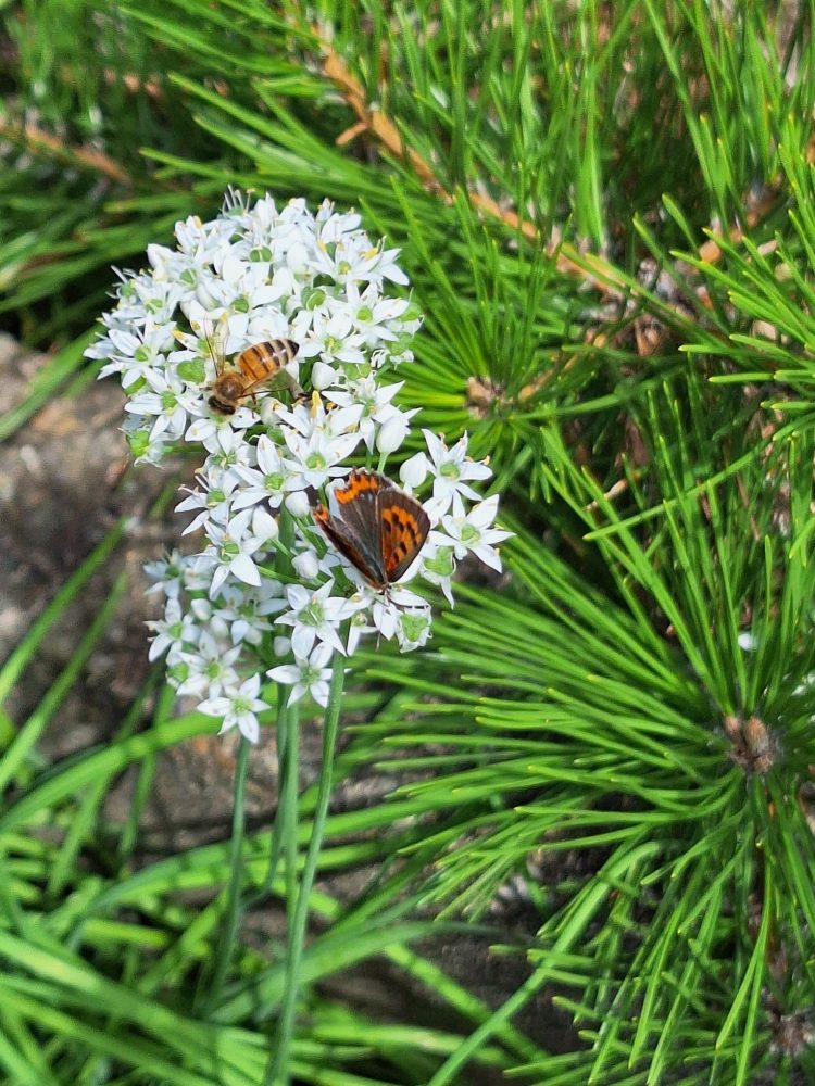 ニラの花にミツバチと蝶々(ベニシジミ)がとまり、遊んでいました。