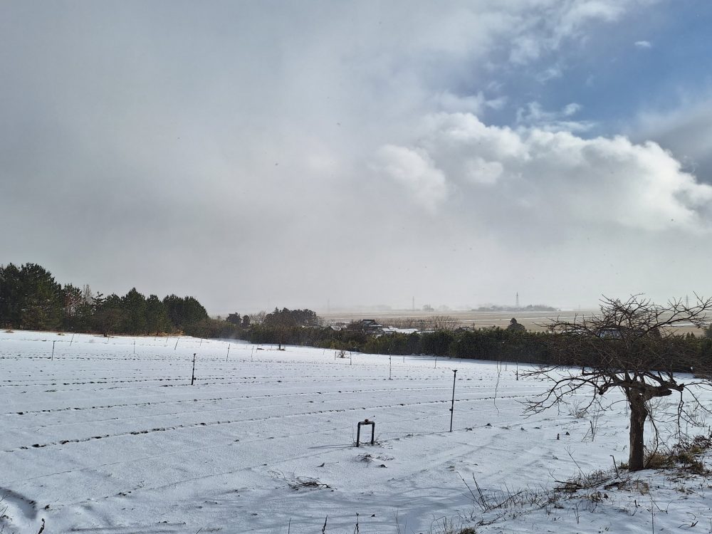 昨夜からの冷え込みで畑は白く、空は青空からどんより雲まで東西南北、賑やかです。